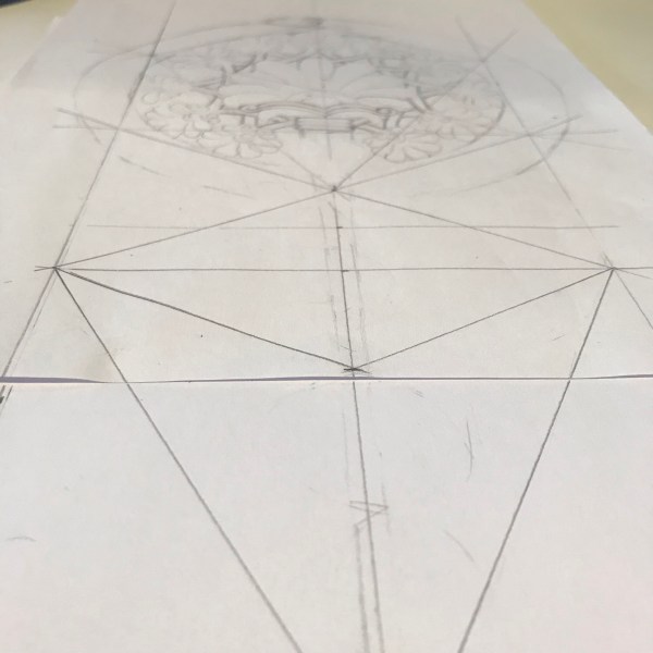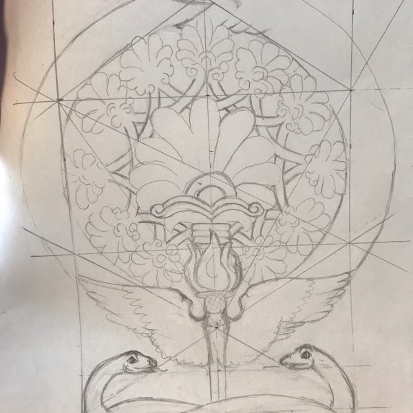Toen ik de kroon, de vlam, een oog en de vleugels van Hermes had uitgegumd werd het tijd om het ontwerp af te maken. De lijnen heb ik met een fineliner gezet en de schaduwen heb ik met een houtskoolpotlood gemaakt. Manlief is er blij mee, ik ben heel benieuwd naar het eindresultaat