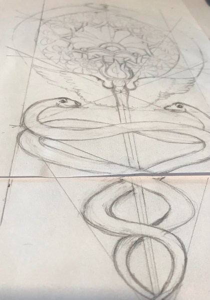 Ik ging compleet los, de Assyrische boom rond gemaakt, maar dan wel zo dat de lijnen van een Kabbala levensboom erdoor liepen. En omdat die langwerpig is en onder het ronde ontwerp doorliep, bedacht ik er nog de staf van Hermes bij, met de vleugels en de vlam. Oftewel een enorm ontwerp vol symboliek uit de oudheid. Iets teveel symboliek, graag alleen de slang en de ronde boom en dan in het midden een beetje opleuken. Zo gezegd zo gedaan, dan maar. Maar ik denk dat de staf van Hermes ook nog wel een keer op papier komt!