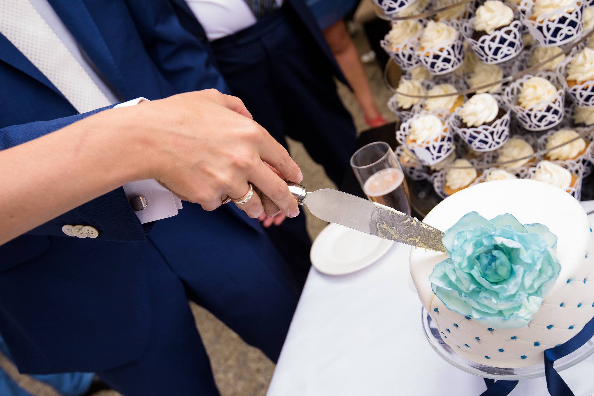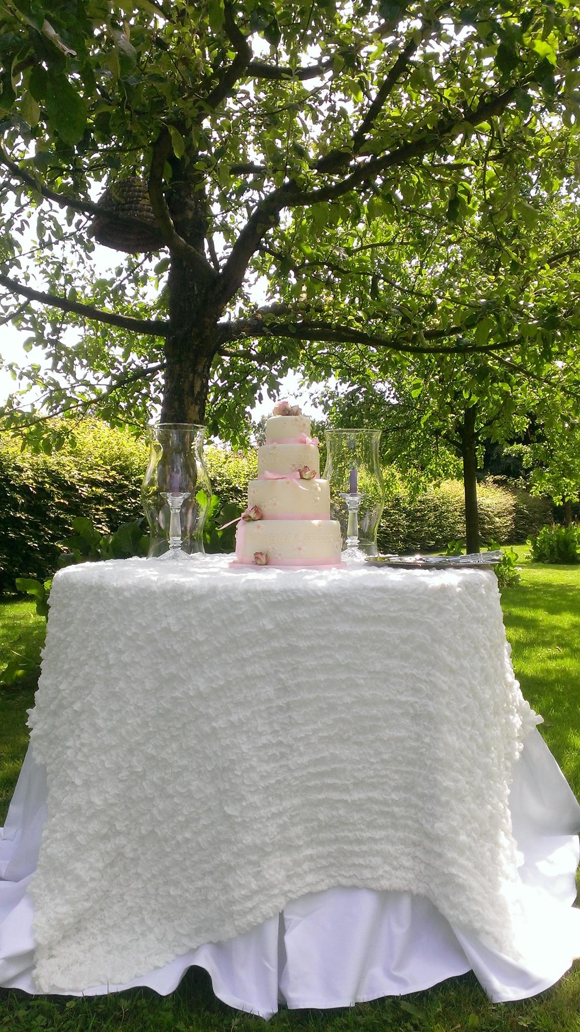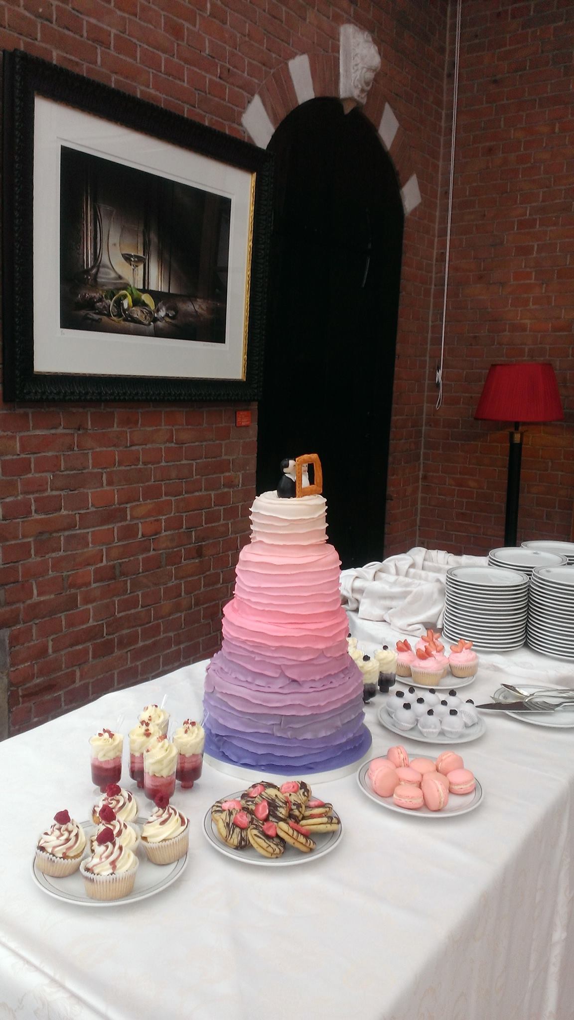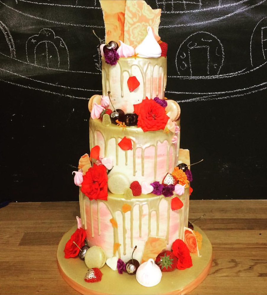 De taart met blauwe “drip” mochten we bezorgen in het kasteel in Woerden, een prachtlocatie! Het was een zomerse, erg warme dag. Bij aankomst hoorden we dat de taart niet naar de keuken hoefde maar direct op de plek mocht komen waar deze zou worden aangesneden. Midden op de binnenplaats, in de volle zon! Op mijn vraag hoe laat de taart zou worden aangesneden hoorde ik dat dat nog wel een paar uur zou duren. Deze taart was alleen maar afgesmeerd met meringuecreme en voorzien van verse, eetbare bloemen. Die taart zou dat niet overleven! Via hobbelige doorgangetjes door het kasteel toch maar naar de keuken en de taart tot het aansnijden koel laten zetten, zoals de bedoeling was.
