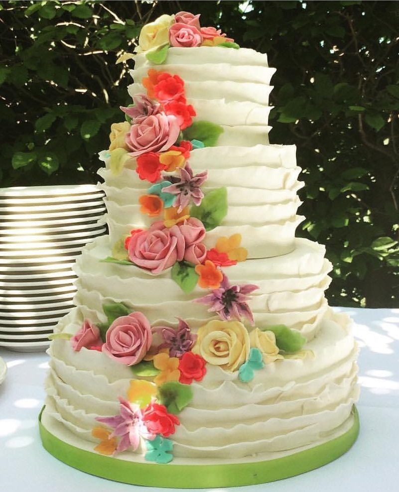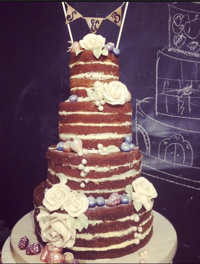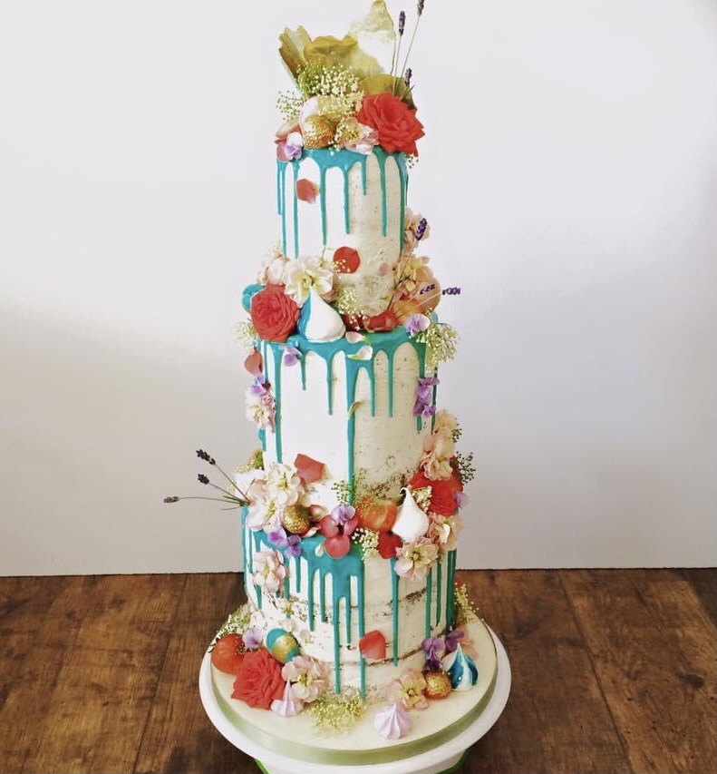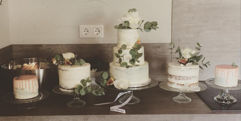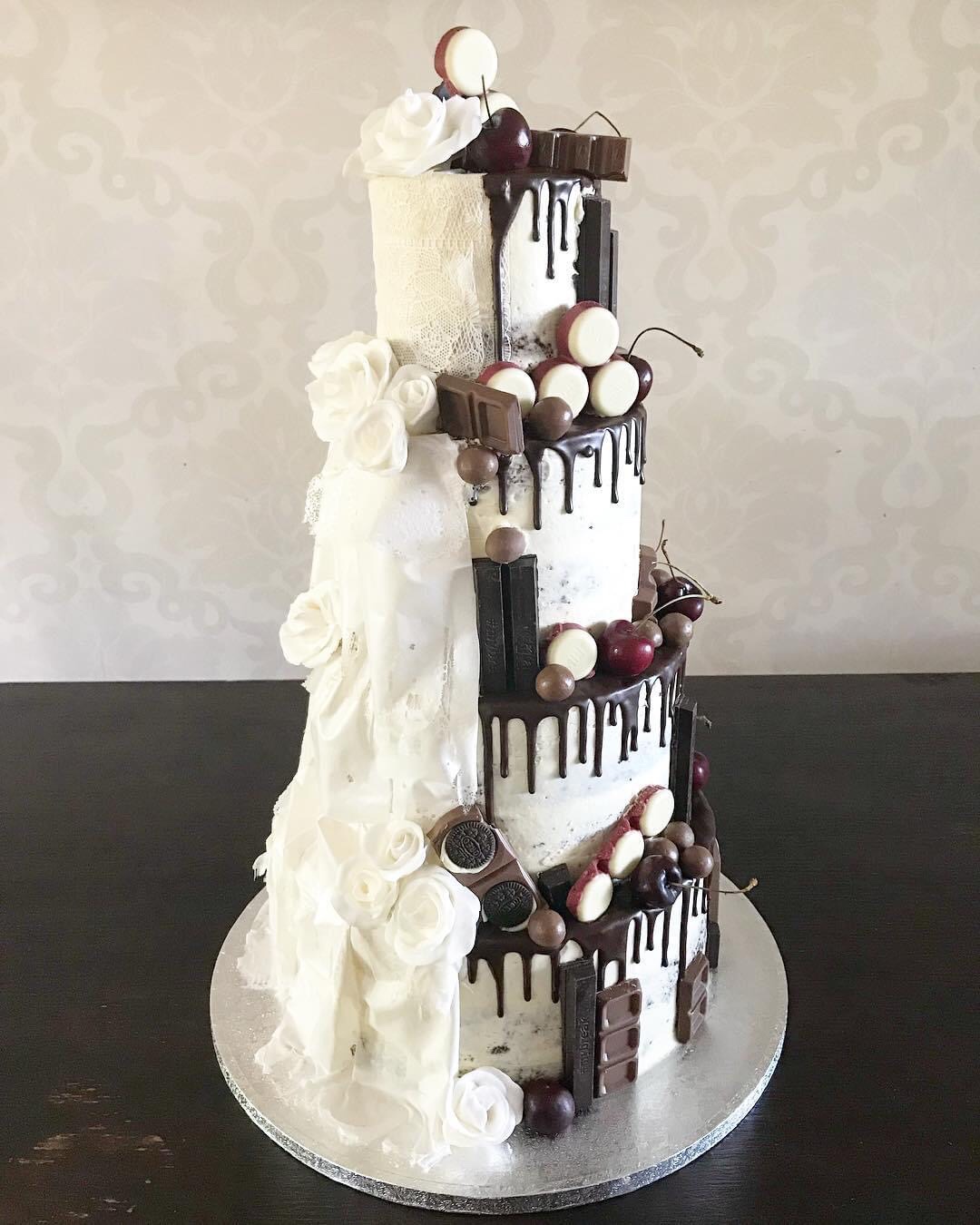 Dat een bruidstaart niet altijd bekleed hoeft te zijn met marsepein bewijzen deze foto’s wel. Afgesmeerd in welke kleur dan ook met een chocoladeganache drip in welke andere kleur dan ook of gewoon helemaal “bloot”, met decoratie naar keuze wordt zelfs een kale taart heel persoonlijk.